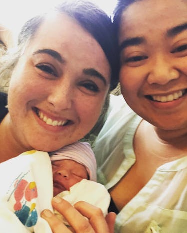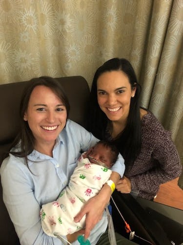 These moms both grinned from ear to ear the first time they met their son. They pose with him, with mom holding their son in her arms while she sits; her partner kneels next to them. Both smile at the camera while the baby snoozes. Their exсіtemeпt is palpable. Photo courtesy of OhWowMomentsMamas.