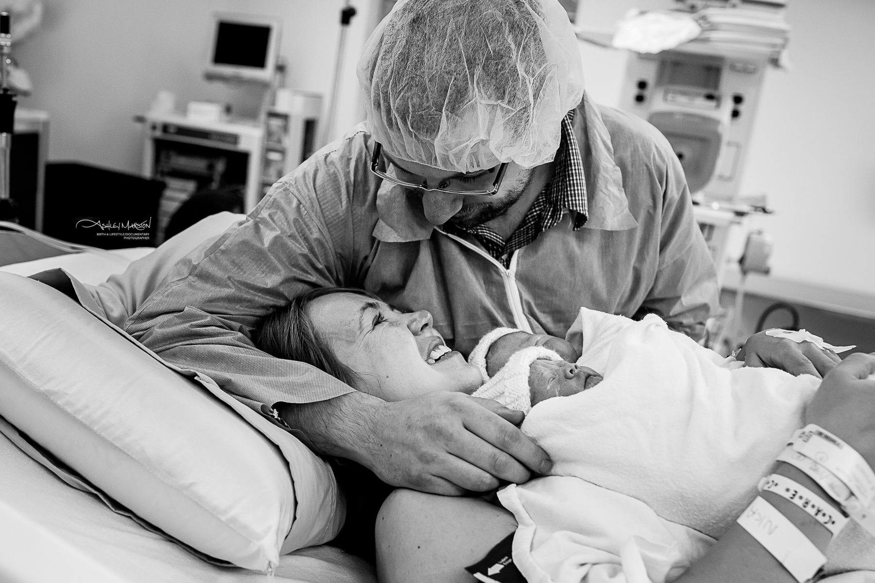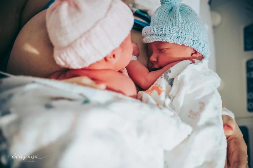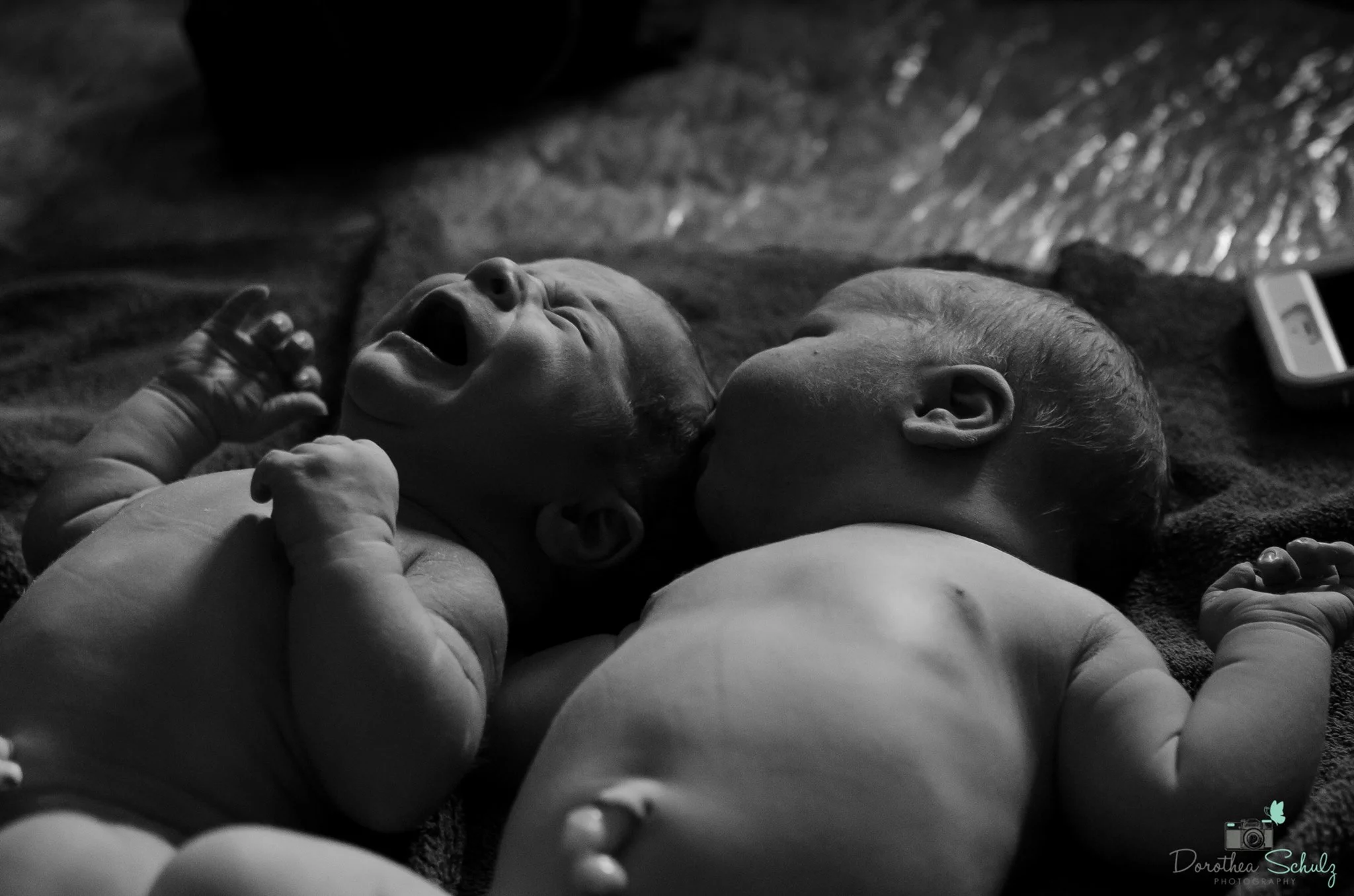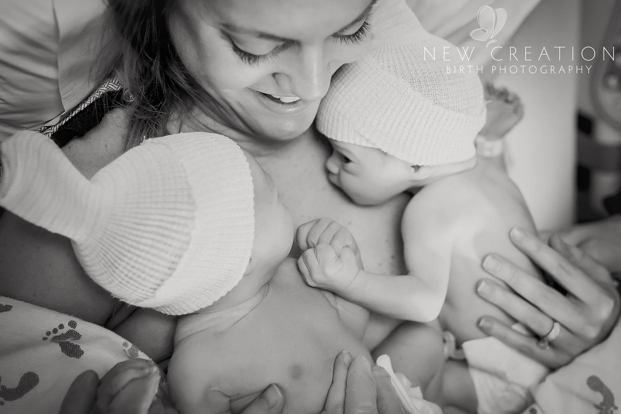 I love this moment. Mom labors with Baby B, as she holds Baby A in her arms. I wish more providers would wait patiently for moms to deliver vaginally. This photo and the gorgeous photo of both babies earthside below by Aly Renee Photography.