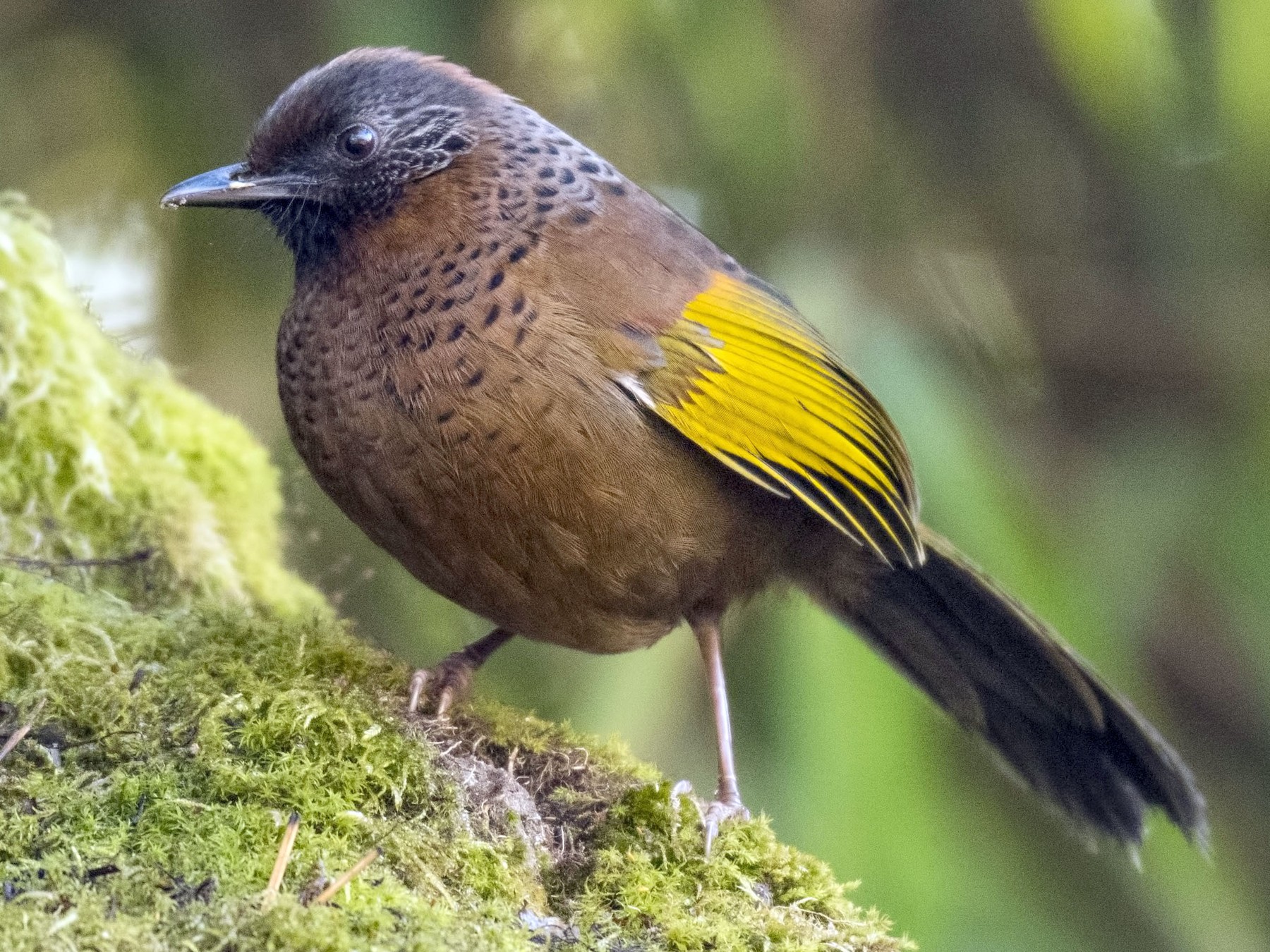 The ear-coverts are black streaked with white and the mantle and breast are scaled with black. The wings and the sides of the tail are olive-yellow
