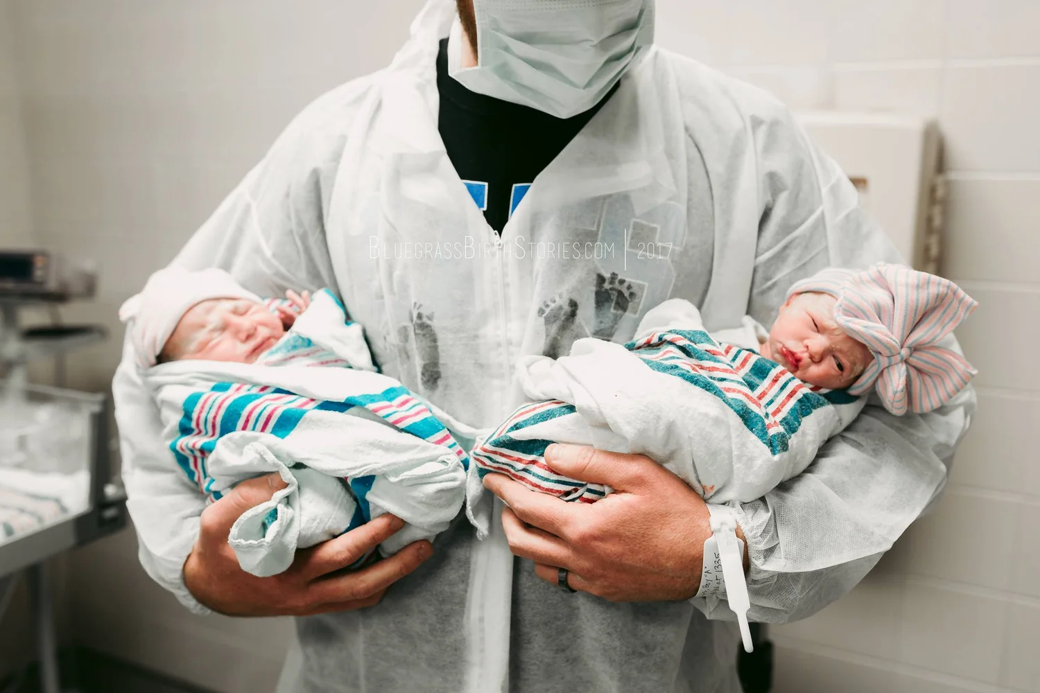 I love this moment. Mom labors with Baby B, as she holds Baby A in her arms. I wish more providers would wait patiently for moms to deliver vaginally. This photo and the gorgeous photo of both babies earthside below by Aly Renee Photography.