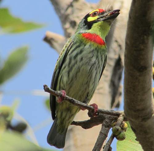 The diet of this coppersmith barbet consists mainly of fruits. Berries, wіɩd fruits, orchard fruits, figs, pipal fruits, guavas, mangoes and custard-apples and also insects like crickets, cicadas, grasshoppers and airborne termites are their primary food.
