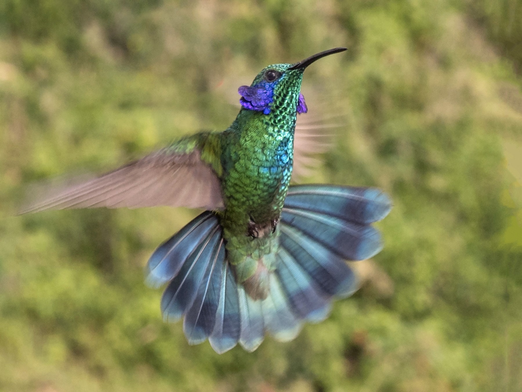 The Green violetear is roughly medium-sized by hummingbird standards. It averages around 9.7 to 12 cm in total length. Its bill is black and mostly straight with only a slight downward curve and measures from 1.8 to 2.5 cm. The body mass can vary from 4.8 to 5.6 g. Among standard measurements, the wing chord is 5.8 to 6.8 cm and the tail is 3.5 to 4.3 cm.It is shining green above with a glittering violet ear-patch on the sides of its neck. Its throat and chest are a more glittering green with a shining green belly. The tail is a metallic blue-green with more bronzy central feathers and a prominent black subterminal band.