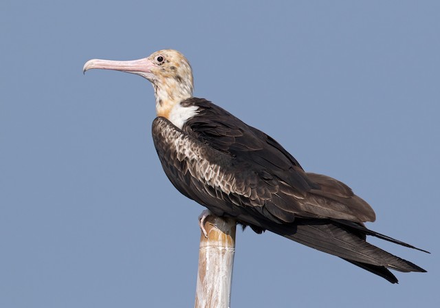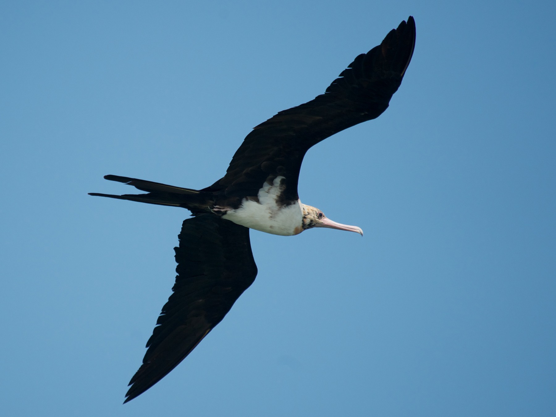 With a wingspan of up to 2.5 meters, they can be differentiated from the great frigatebird (a close relative) by the white patch on their Ьeɩɩу.