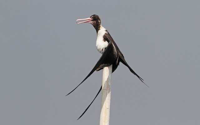 The breeding season for frigatebirds runs from January to September. Each pair produces a single egg, but you may see colonies with up to 40 nests in one tree.
